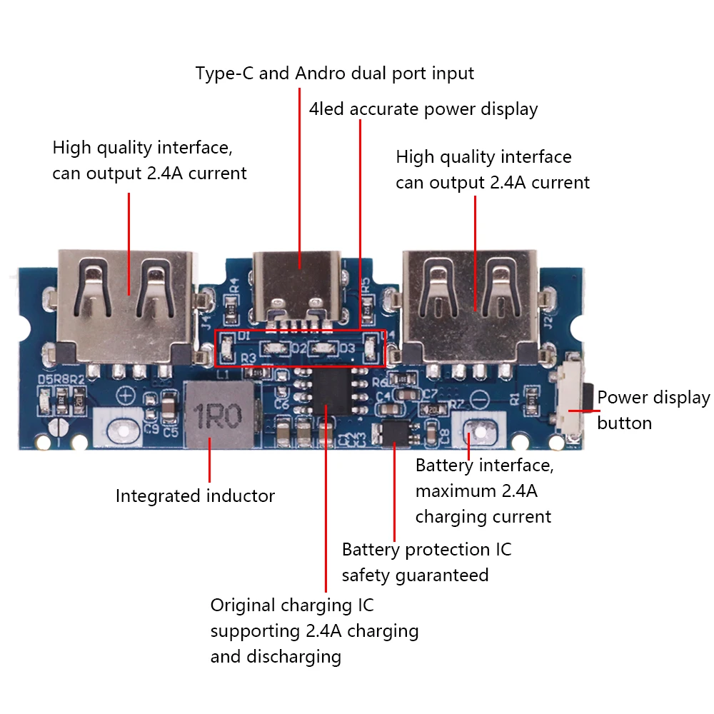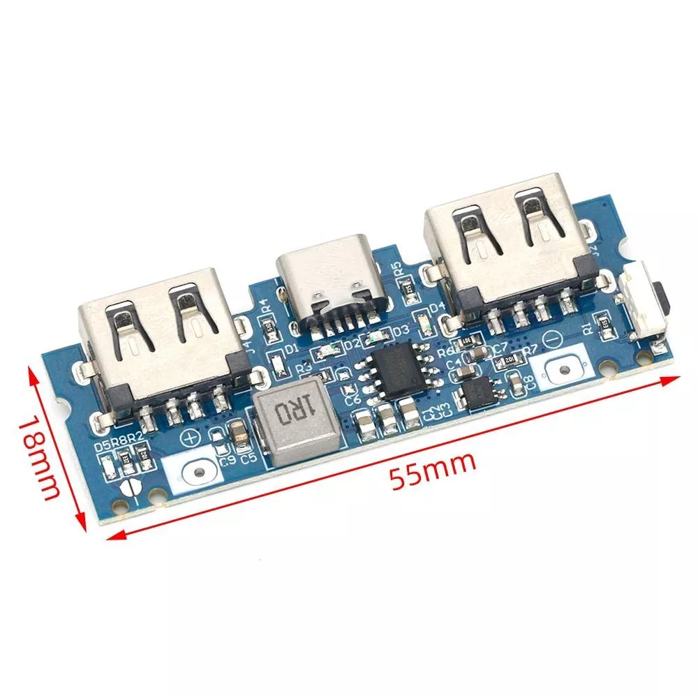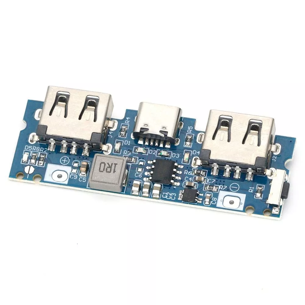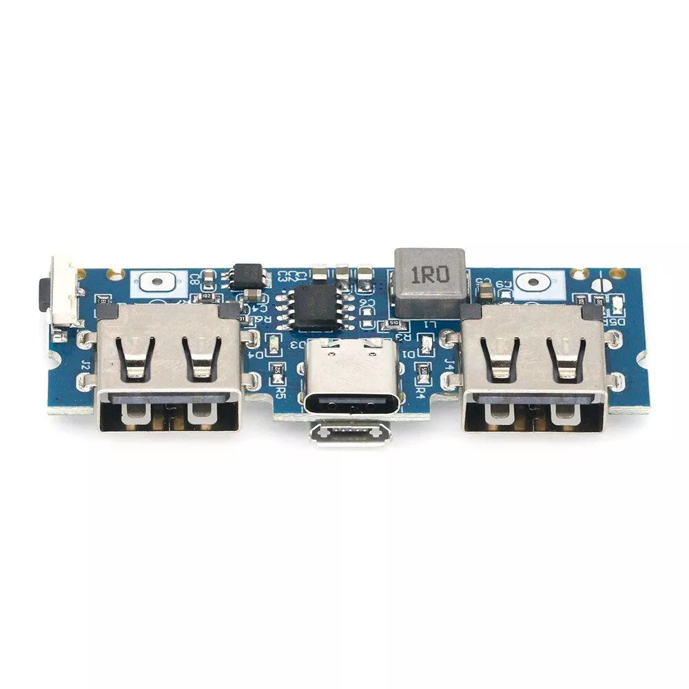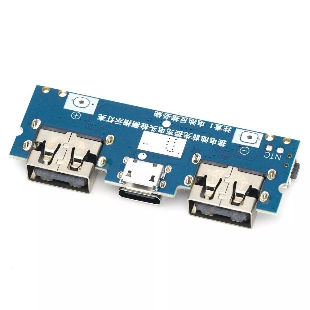 This is Dual USB 5V 2.4A Micro/Type-C USB LED Mobile Power Bank 18650 Charging Module which consists of 2 no. of USB port, 1 no. Micro USB and Type C port as fast charging power bank module due to high current rating.