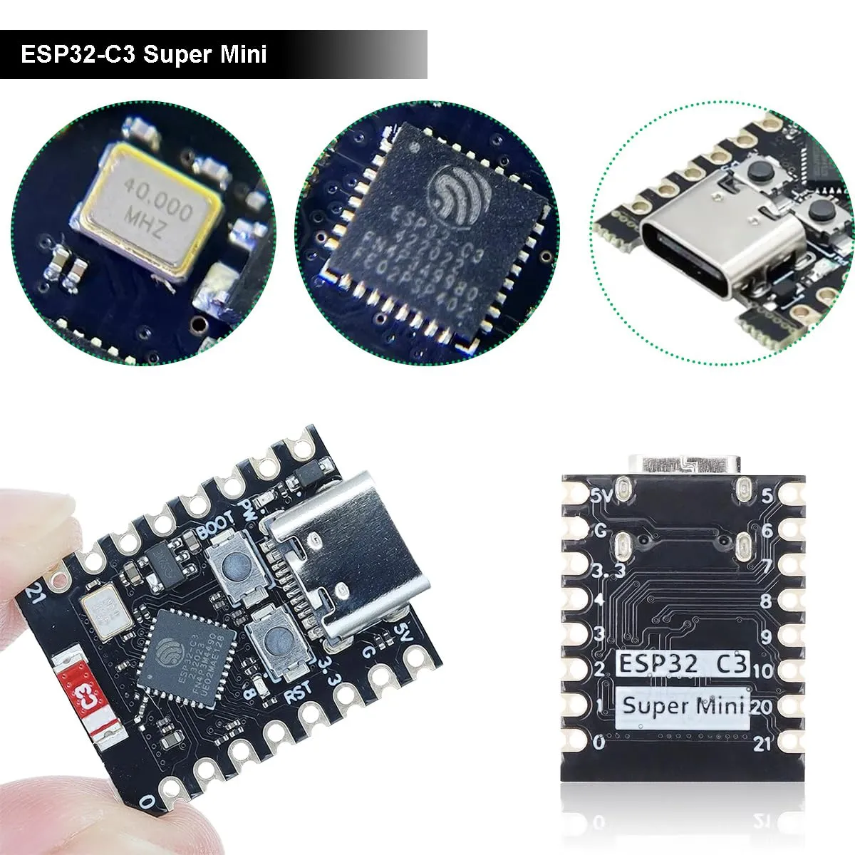 The ESP32-C3 Super Mini Development Module is an ultra-compact, high-performance development board built around the Espressif ESP32-C3 dual-mode Wi-Fi and Bluetooth 5 (LE) SoC. It features a 32-bit single-core RISC-V processor running at up to 160MHz, with onboard 4MB flash, 400KB SRAM, and 384KB ROM. Designed for IoT, wearable, and low-power embedded applications, it delivers advanced wireless capabilities and rich peripheral support in a tiny, space-saving form factor.