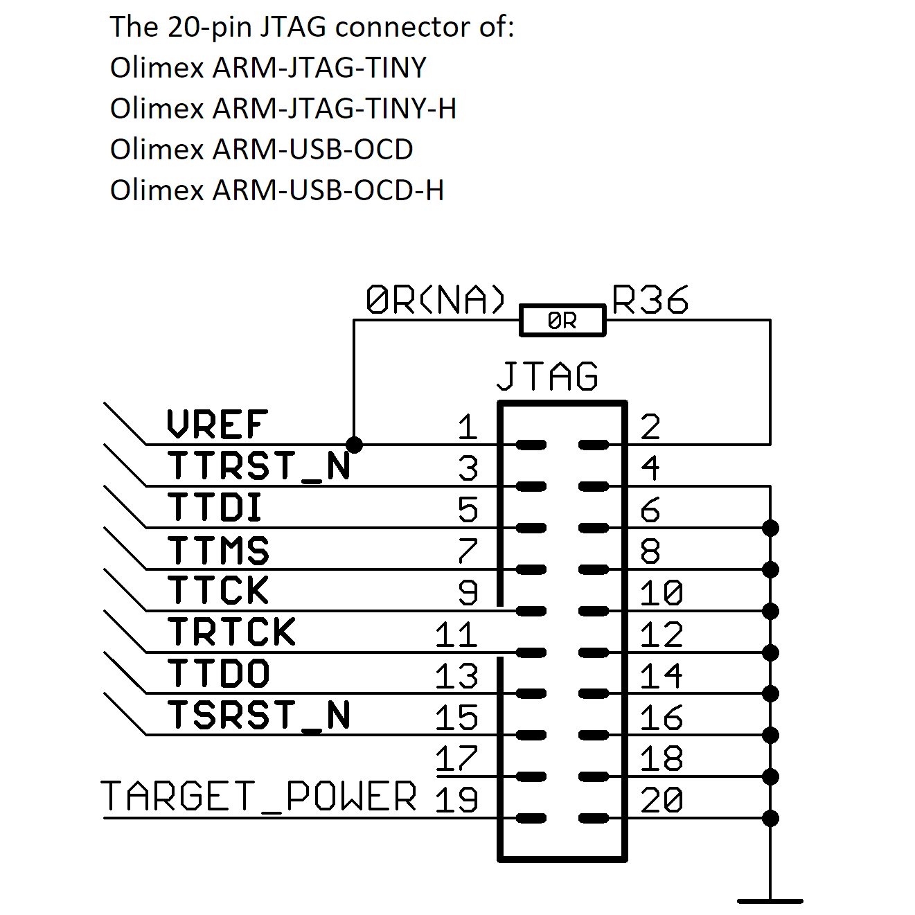 - Uses ARM’s standard JTAG connector (2 rows × 10 pins at 0.1” step)