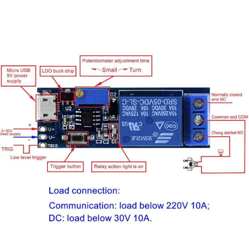 The Relay Module with Trigger Delay Timer 5-30V with Micro USB is a highly versatile and user-friendly device engineered for precise control of electrical loads with a customizable delay. Operating on a wide voltage range of 5-30VDC, this module offers flexible power input options through a convenient Micro USB port or terminal blocks, ensuring compatibility with a variety of power sources, from standard USB chargers to industrial power supplies. This adaptability makes it an excellent choice for technical writers documenting electronics projects for e-commerce platforms, as it caters to both hobbyists and professional engineers.