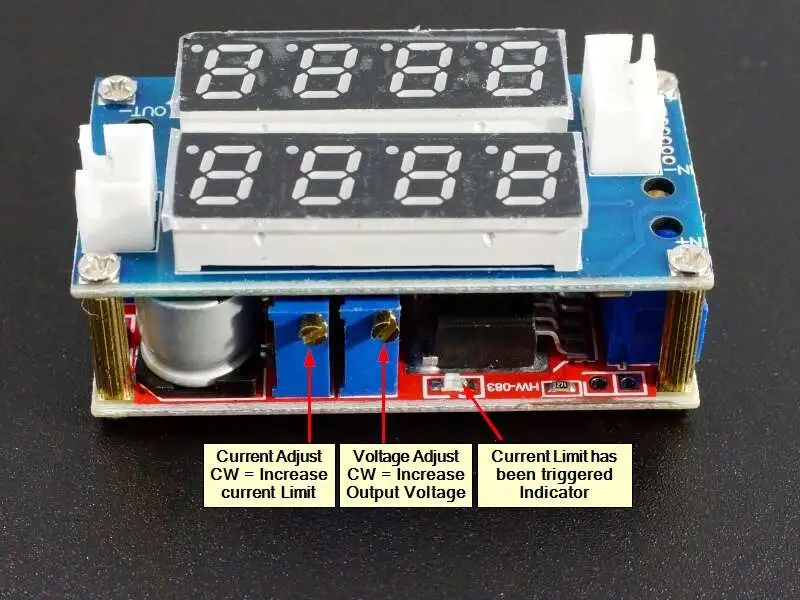 There are two on-board multi-turn pots for adjusting output voltage and setting current limiting.