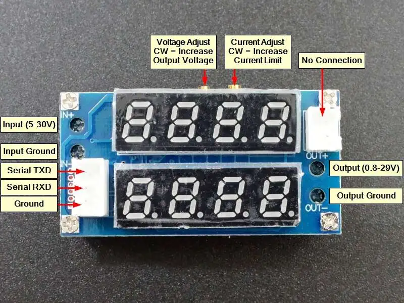 The module is rated for an input of 5V – 30V with an output voltage of 0.8V – 29V at up to 5A. The module runs very comfortably at 1.5A and should be limited to around 3A unless some air flow is provided through the module to help keep things cool.