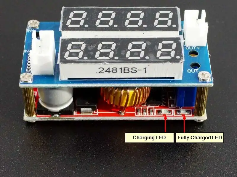 The potentiometer towards the middle of the module is used for adjusting the output voltage which is shown on the top LED display.