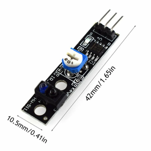 The Tracking Line Follower Sensor 3 Pin HW-511 is an infrared reflective sensor module engineered for accurate line detection in robotics and automation projects. Utilizing the TCRT5000 sensor, which combines an infrared emitter and phototransistor, the module detects reflected infrared light from surfaces. It provides a digital output that changes state based on the presence or absence of a reflective surface, enabling precise line tracking functionality. The module’s compact design and compatibility with 3.3V to 5V systems make it suitable for integration into various microcontroller-based applications.